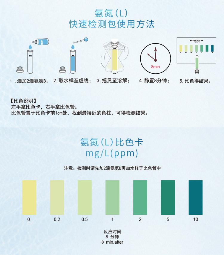 2.本產(chǎn)品檢測水中游離態(tài)的氨(NH3)或銨離子(NH4+)含量在0-10mg/L(ppm)范圍內(nèi),若要檢測10mg/L以上濃度水樣,請(qǐng)預(yù)先稀釋水樣后再進(jìn)行測定,具體操作見稀釋說明書。